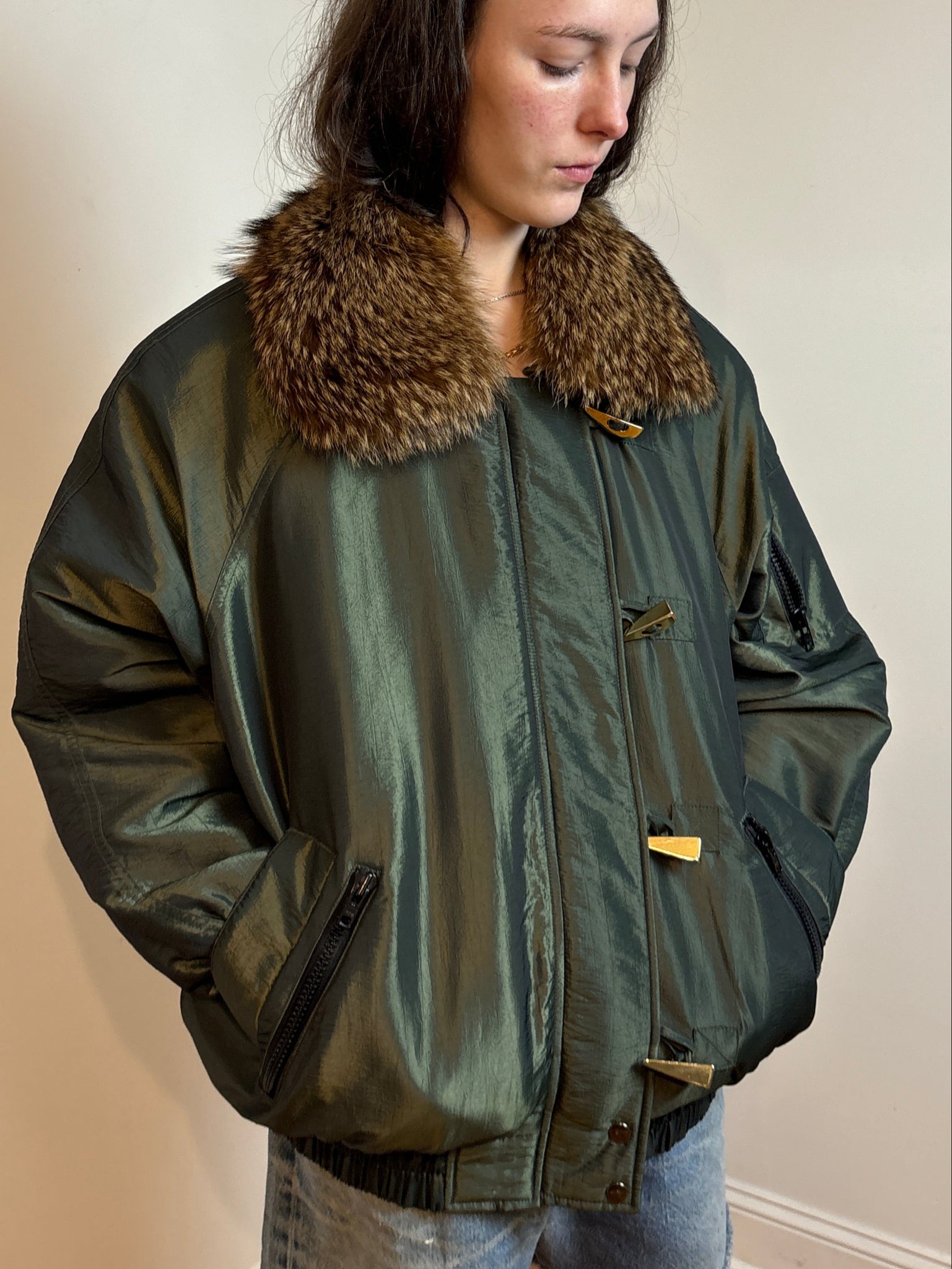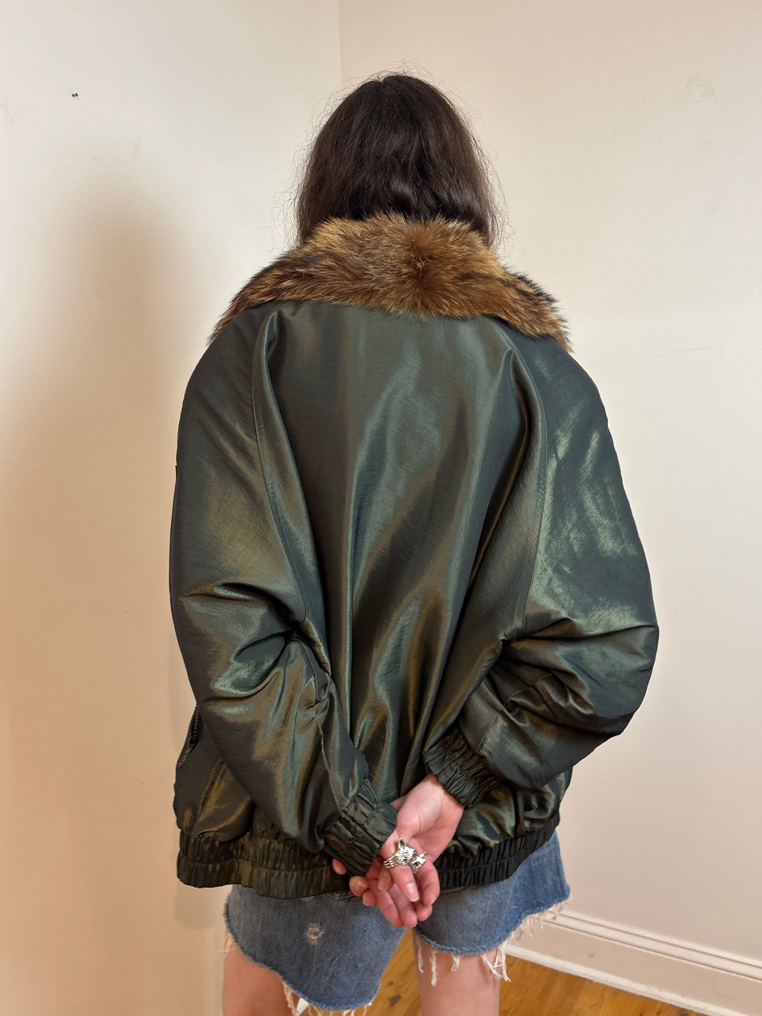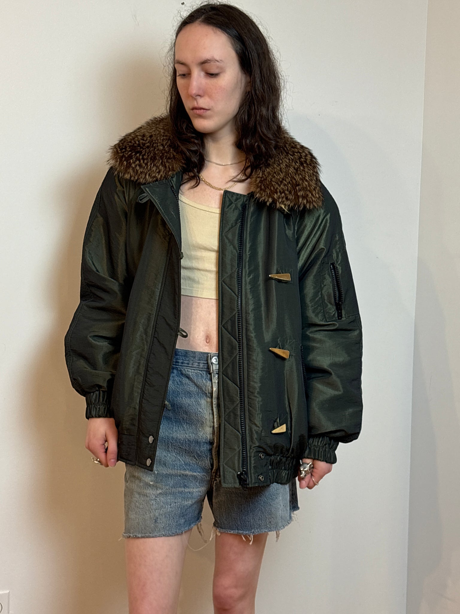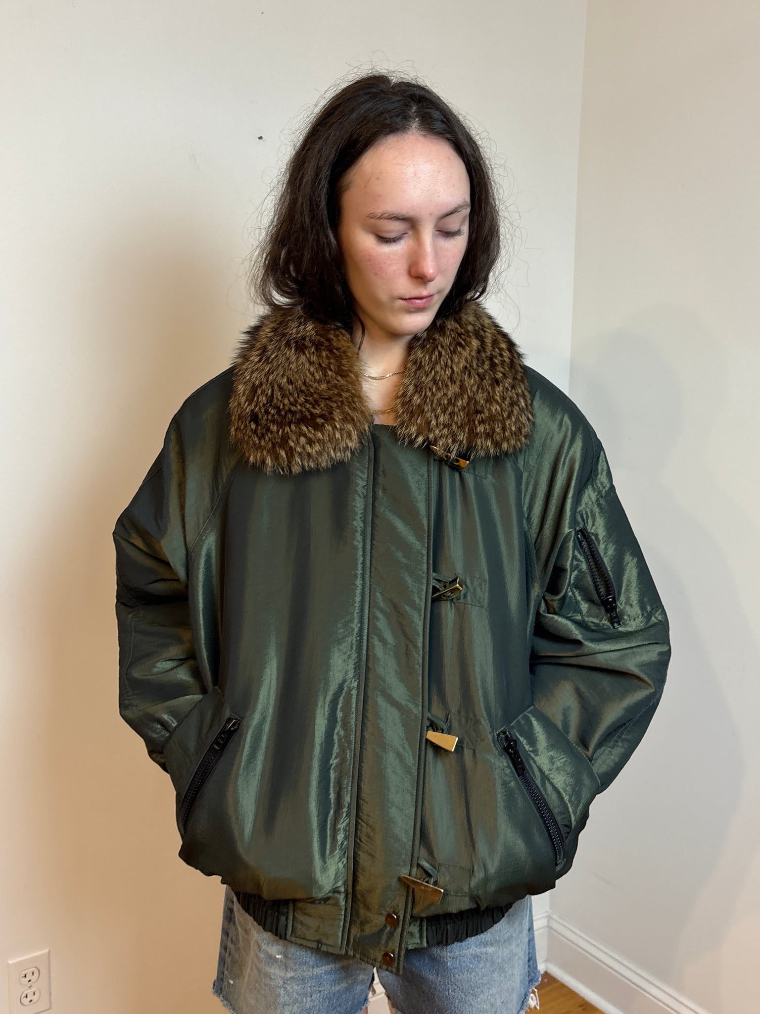 Oversized style, insulated silky bomber featuring a removable genuine raccoon fur collar. Chunky zippered closure at front with four gold toggle button reinforcement closures. Two chunky zippered pockets at waist with two welted slit pockets behind. One chunky zippered pocket at left sleeve. Elastic cuffs and waistband. Two snap button reinforcement closures at hem. Fur collar attached with buttons along neckline and snap buttons at tips of jacket collar. 80's Carole Little.