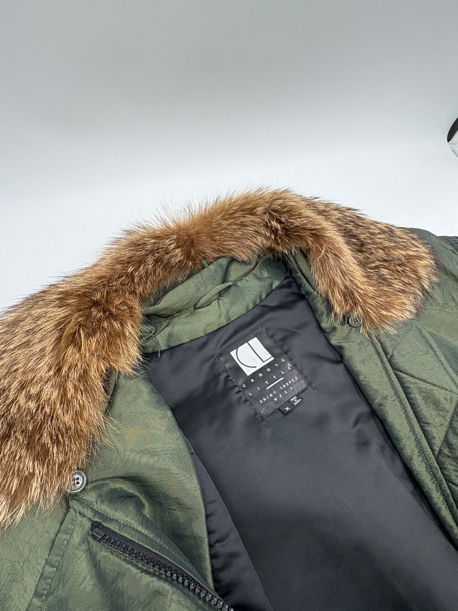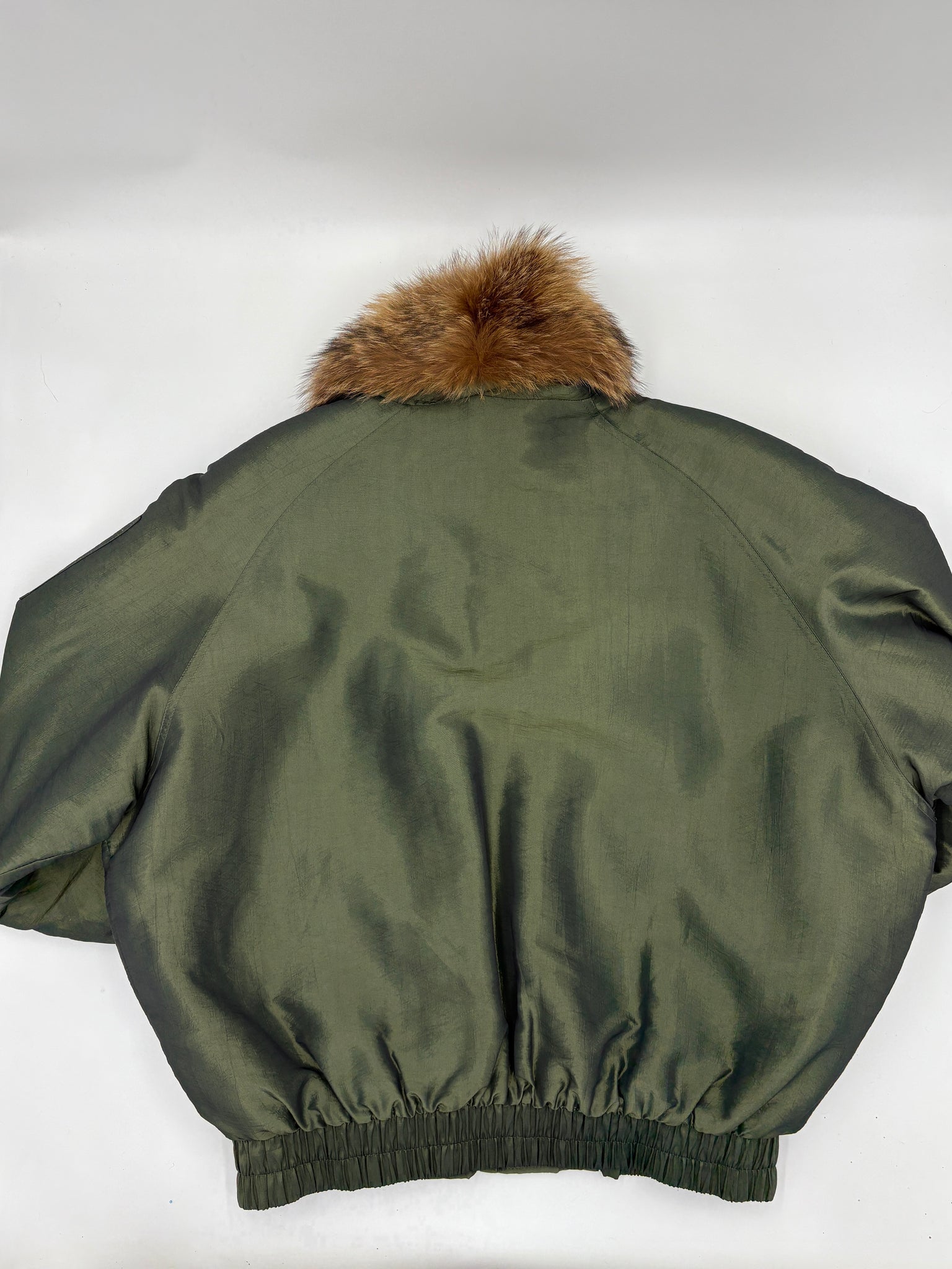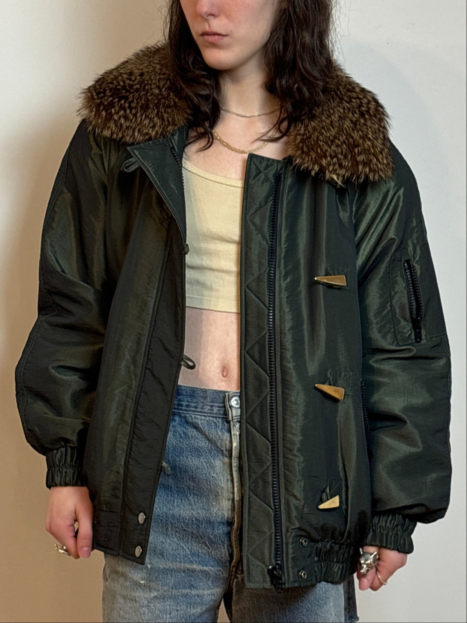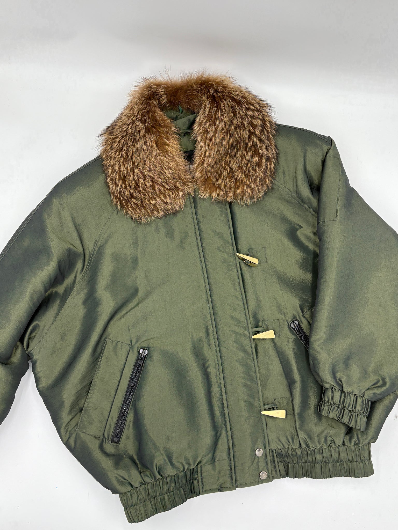 Oversized style, insulated silky bomber featuring a removable genuine raccoon fur collar. Chunky zippered closure at front with four gold toggle button reinforcement closures. Two chunky zippered pockets at waist with two welted slit pockets behind. One chunky zippered pocket at left sleeve. Elastic cuffs and waistband. Two snap button reinforcement closures at hem. Fur collar attached with buttons along neckline and snap buttons at tips of jacket collar. 80's Carole Little.