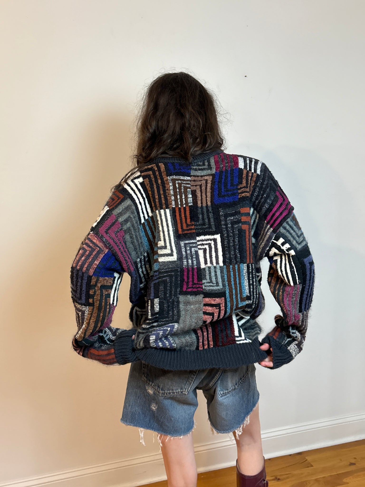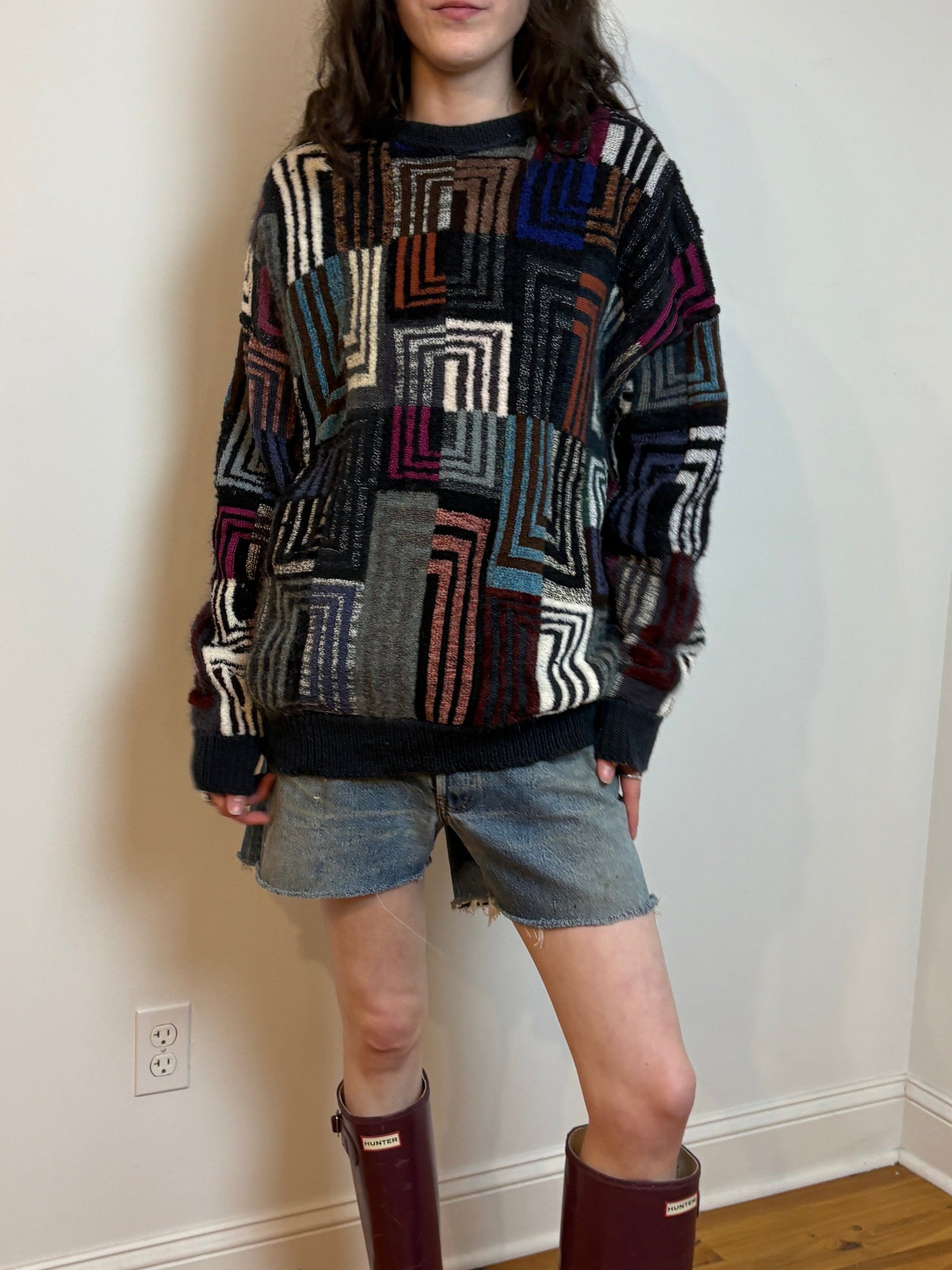 Delightful. Hand woven, trippy geo pattern. Drop shoulder style. Differing textures in the yarns throughout. Rib knit neckline, cuffs and hem. Made in USA.