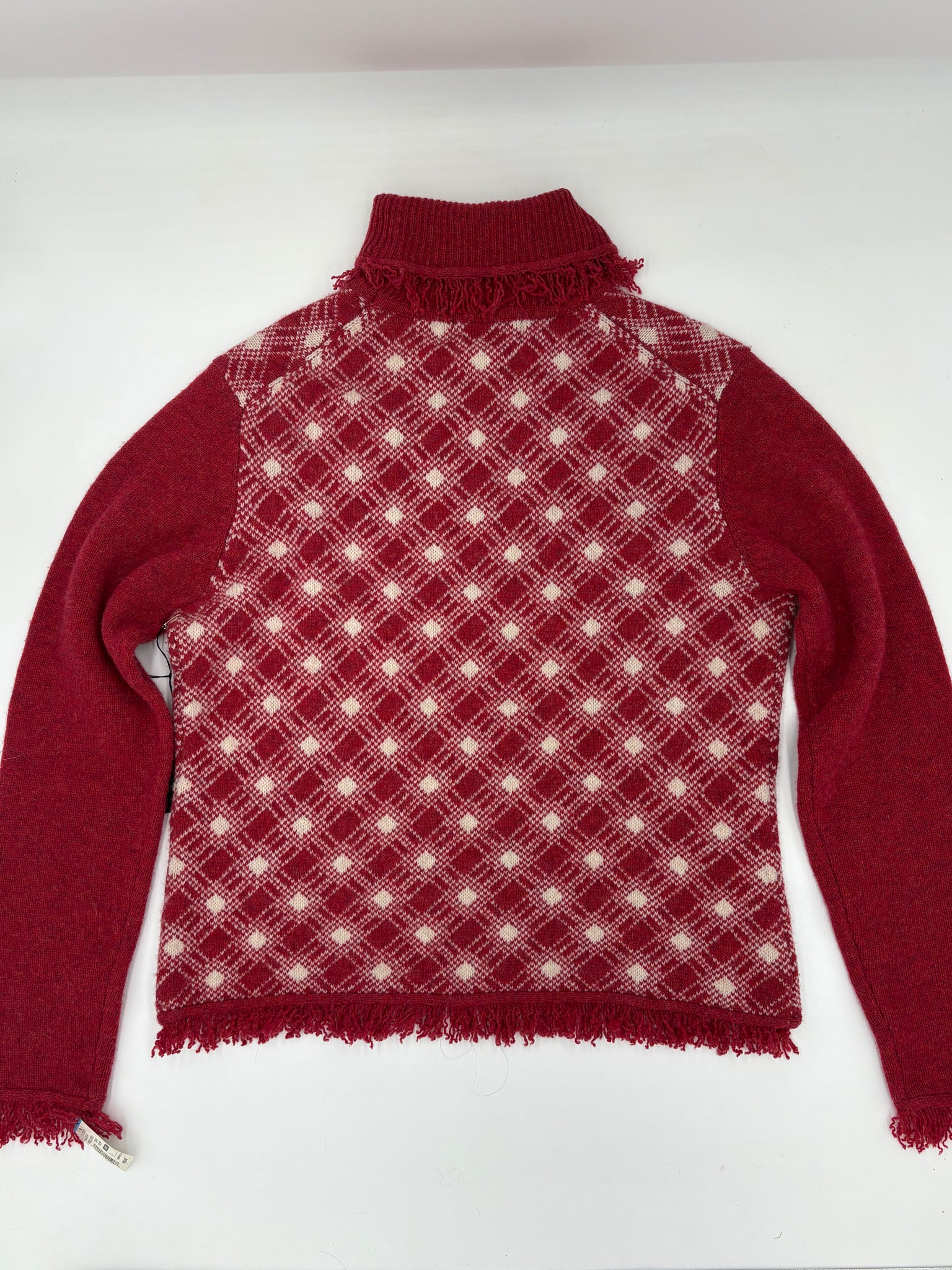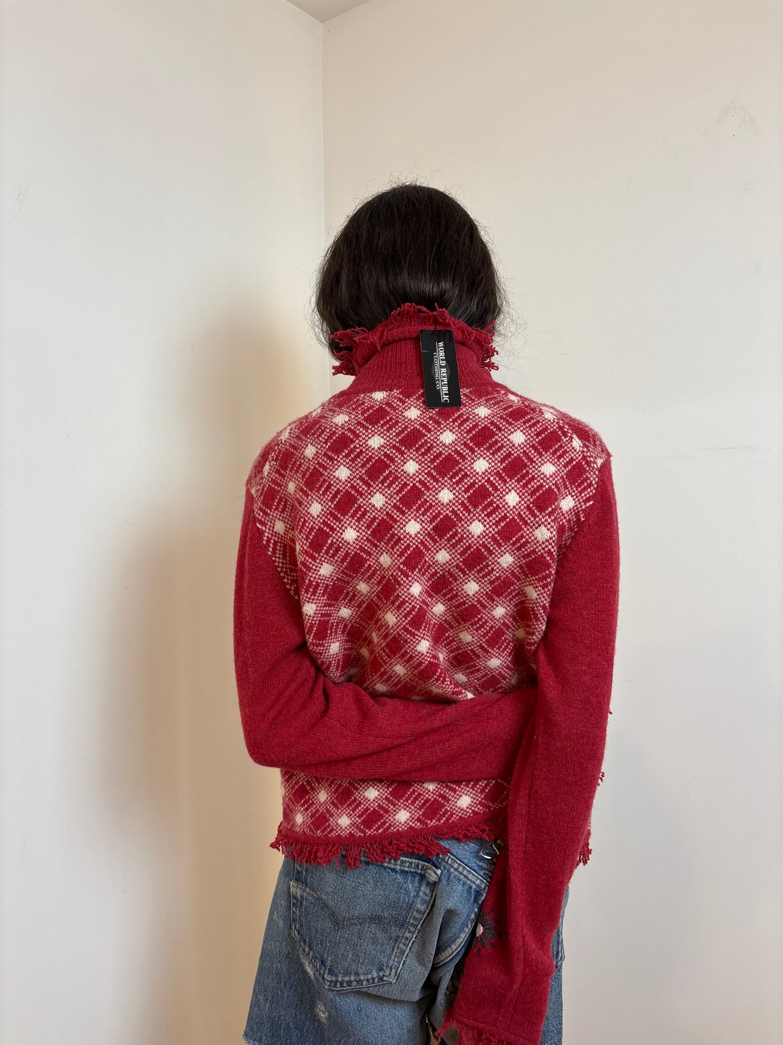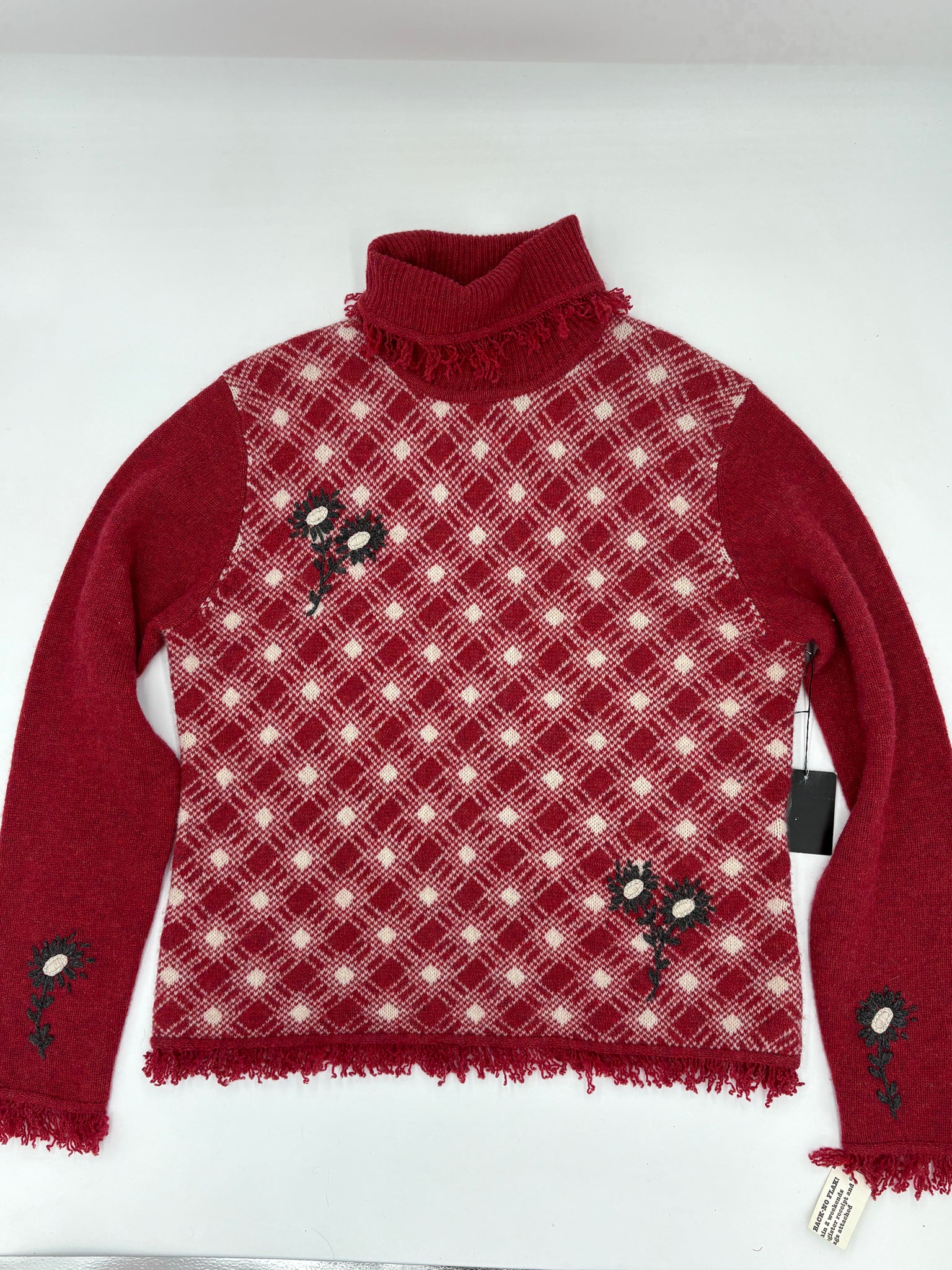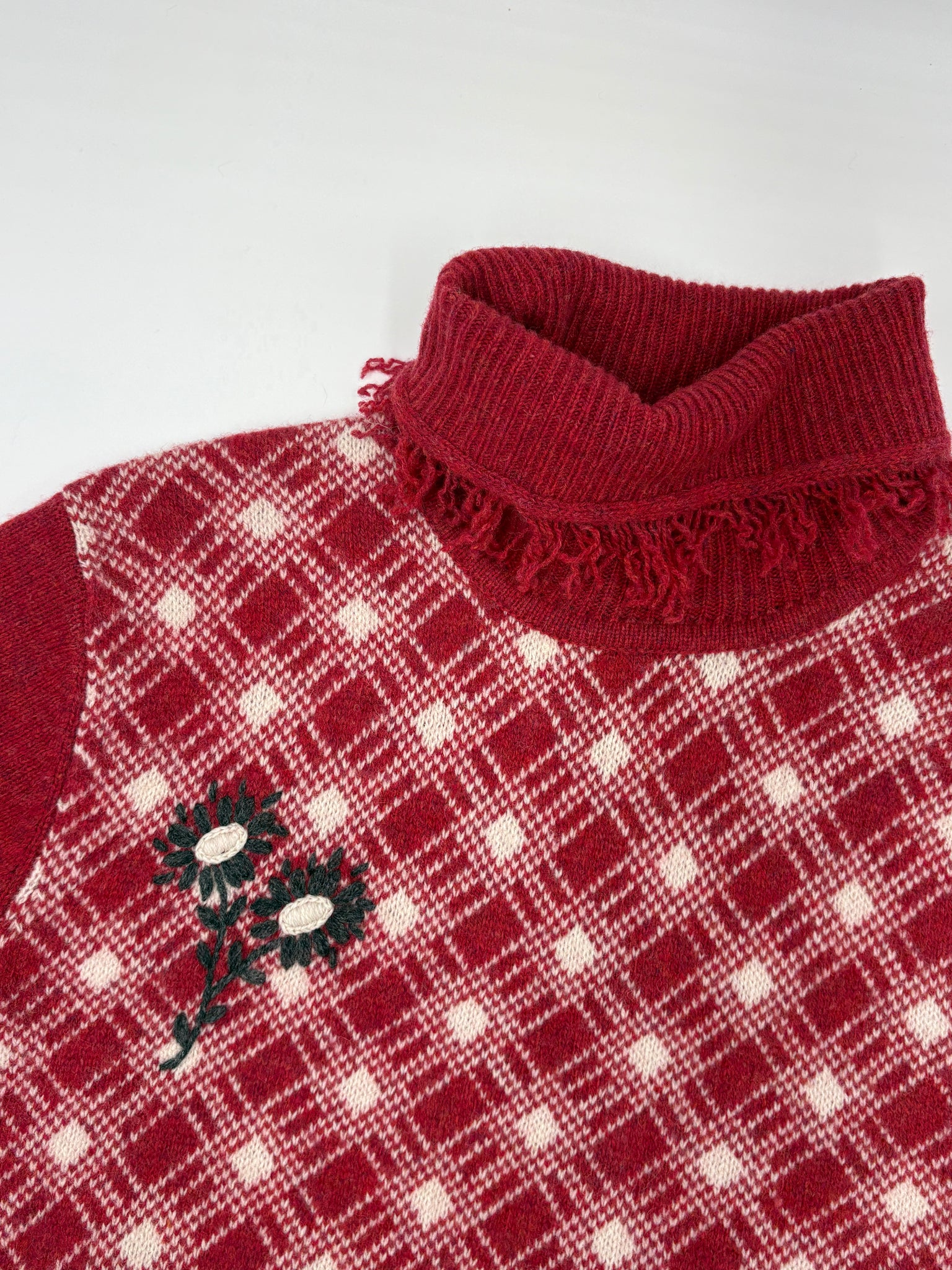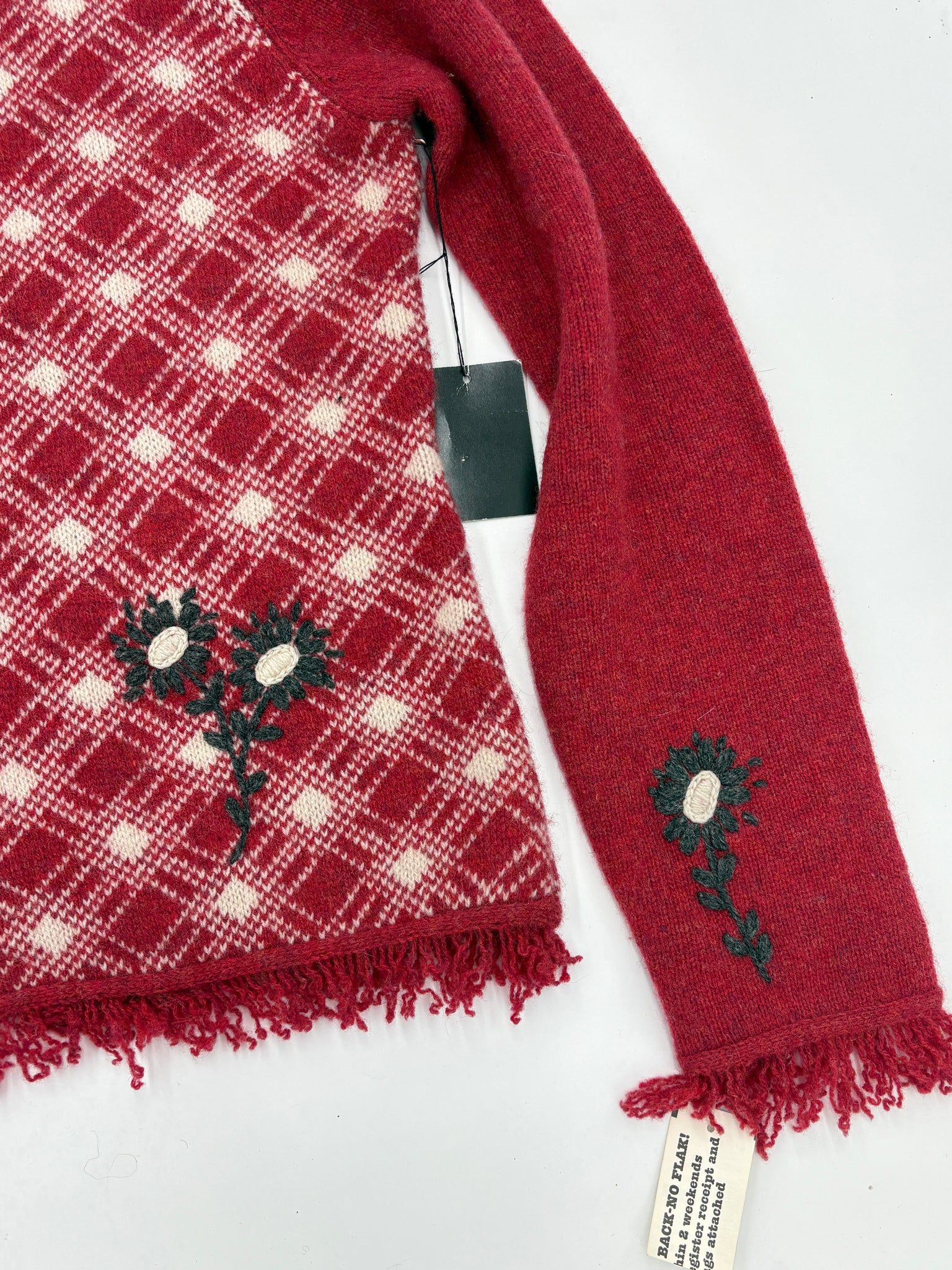 New with tags, never worn wool knit featuring a gingham pattern with hand done floral embroidered details. Fringed turtleneck, cuffs and hems. From brand World Republic Clothing Co. Made in South Africa.
