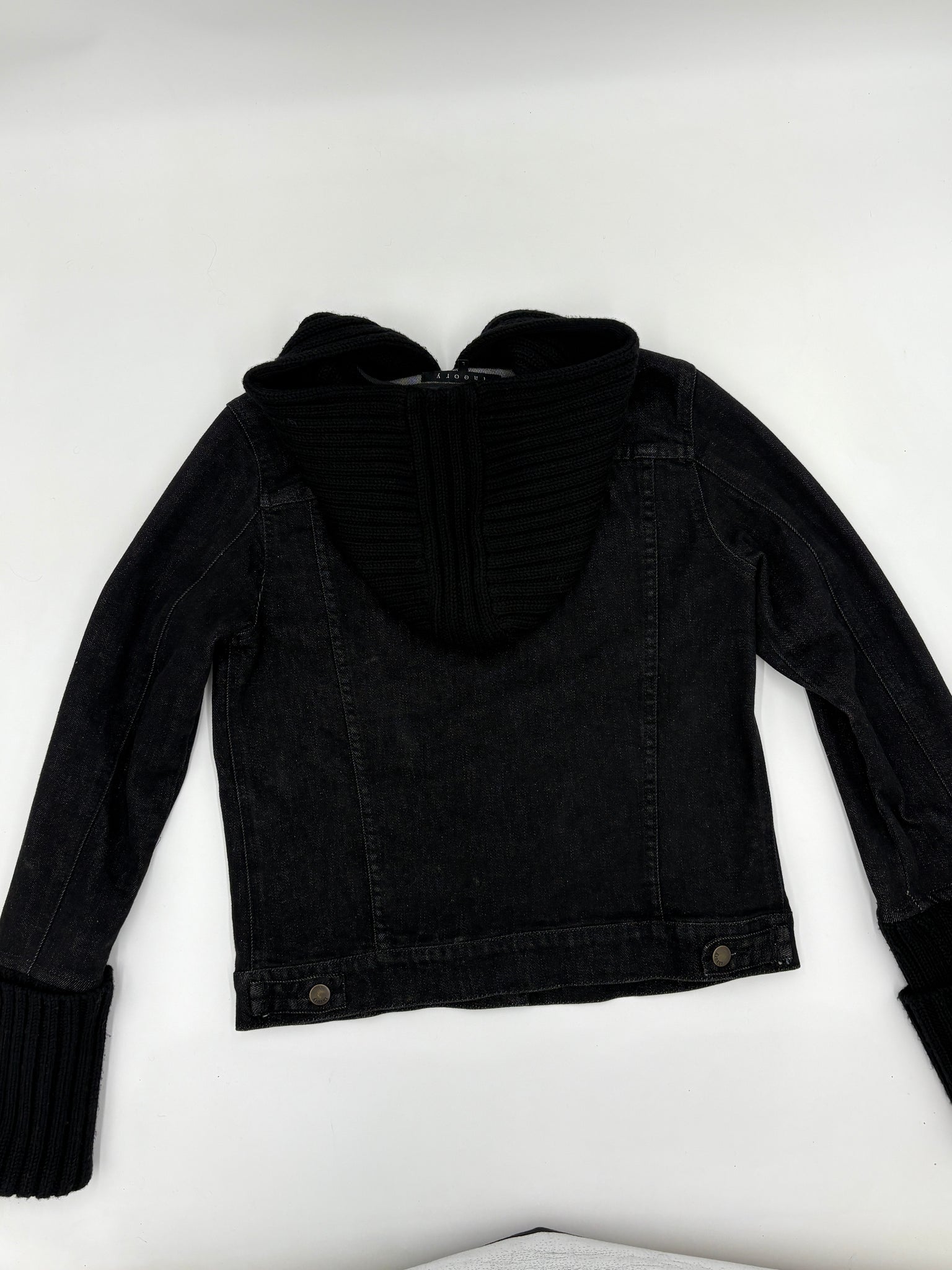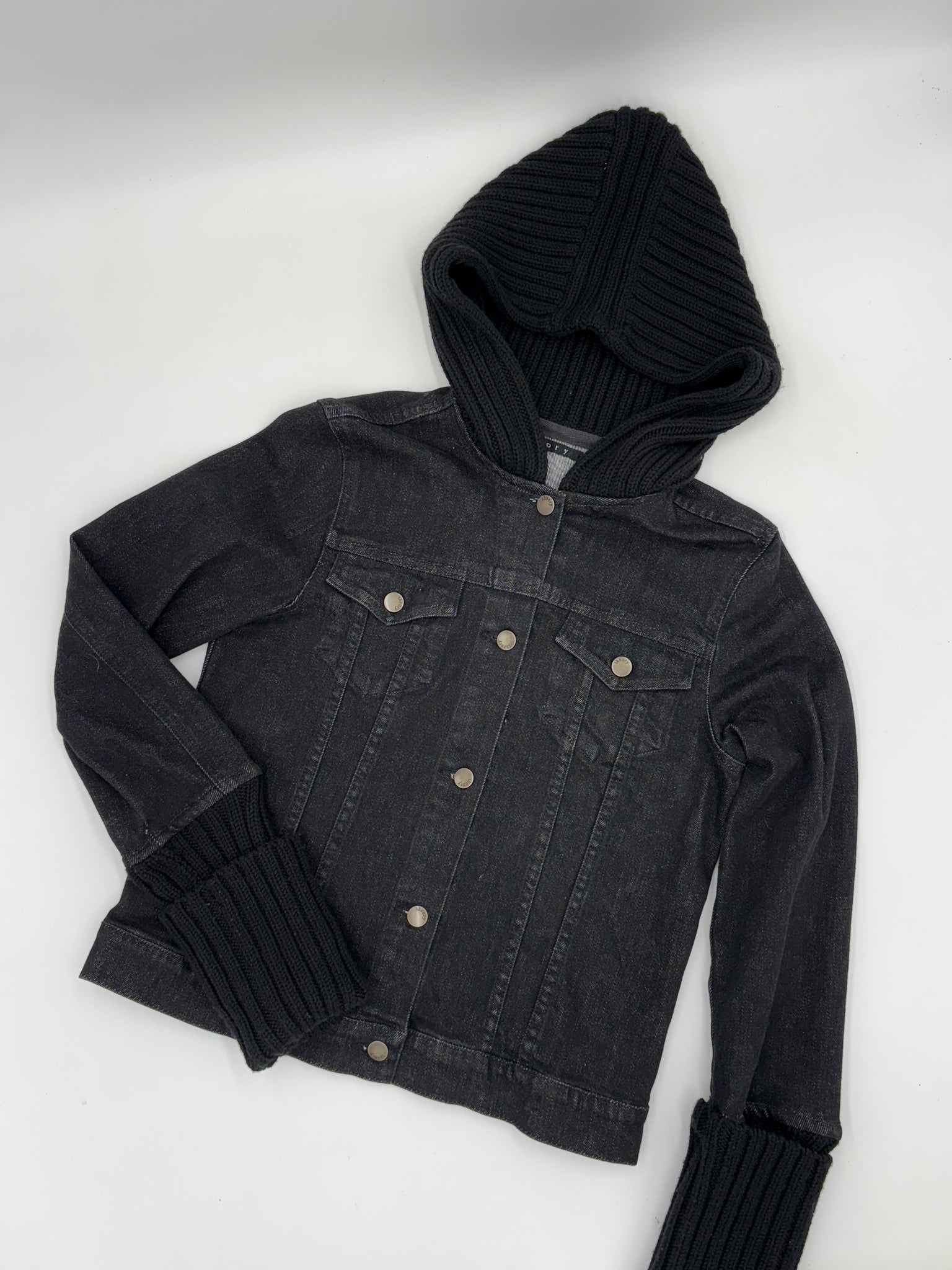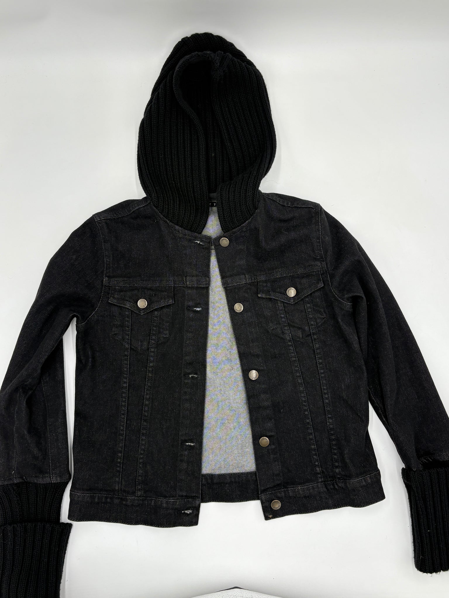 Dark wash denim, trucker style jacket with rib knit hood and cuffs. Five button front closures. Two patch pockets at bust with flap button closures. Unlined. Y2k designer. No label for knit material, but feels like a wool blend.